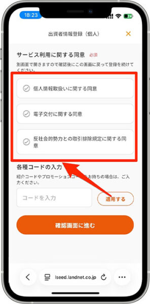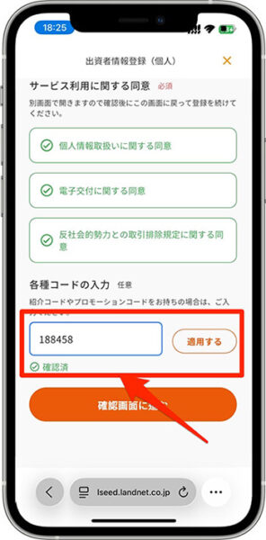 - 紹介コードを入力し、『適用する』をタップしたら、『確認画面に進む』をタップします。
