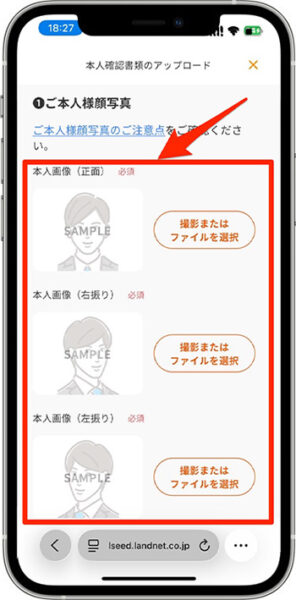 - 『ご本人様顔写真』を3パターン撮影し、アップロードします。
