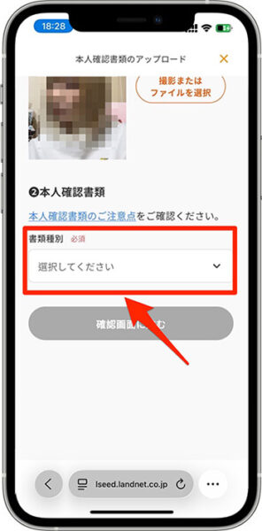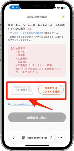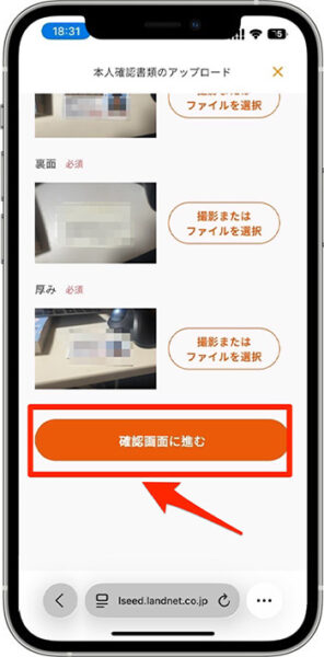 - 『確認画面に進む』をタップし、続いて『本人確認書類をアップロードする』をタップします。