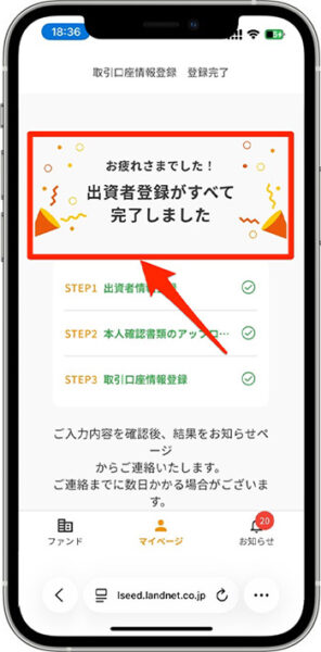 - 『出資者登録がすべて完了しました』と表示されたら、申し込みは完了です。
