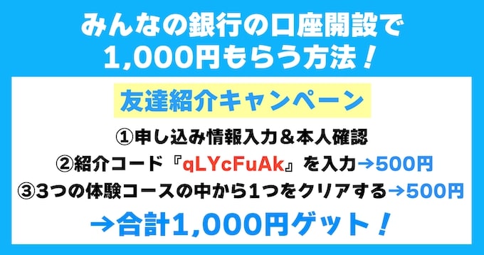 みんなの銀行の友達紹介キャンペーンは口座開設時に紹介コード『qLYcFuAk』を入力&体験コースをクリアするだけで合計1,000円が貰えます。