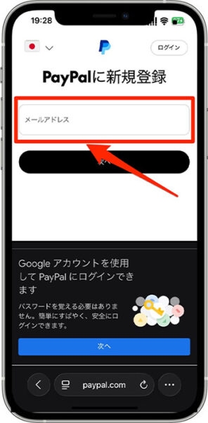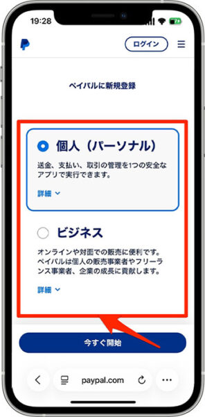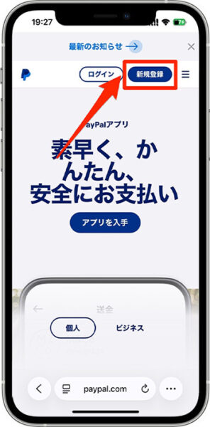 - 紹介リンクからPayPalの公式サイトにアクセスし、『新規登録』をタップします。