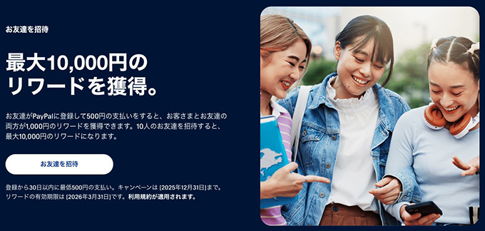 - PayPalを友達に紹介すると最大で10,000円分のリワードがもらえる