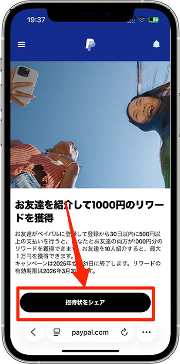 PayPalの紹介コードは『URL形式』なので、間違えないように『招待状をシェアする』をタップして送る方法がおすすめです!