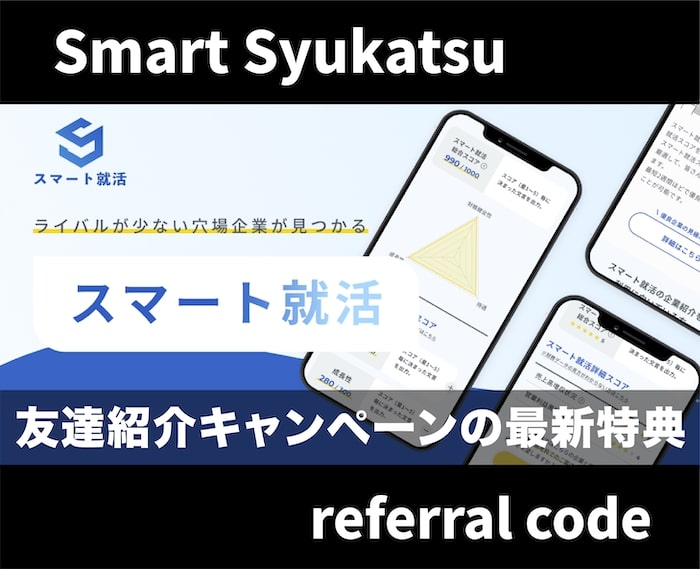 『スマート就活』は穴場度などで企業を探せるサービスで、隠れた優良企業を探せると就活生に人気があります。 そんなスマート就活には、お得に登録できる紹介URLやキャンペーンはあるのでしょうか。 今回は、スマート就活についてや、紹介URL・キャンペー... -
